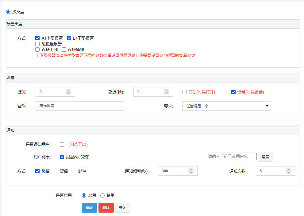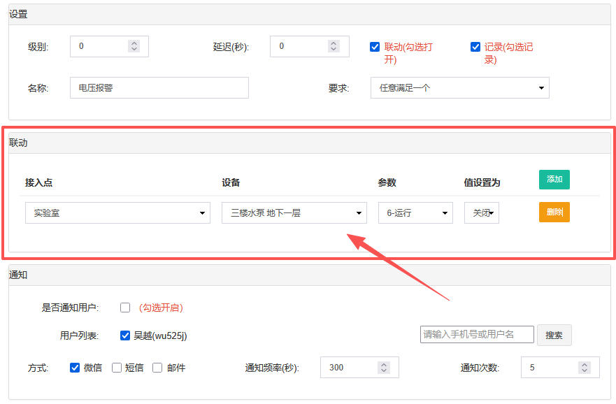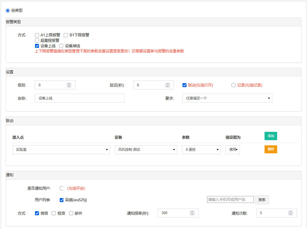 可在后臺(tái)對(duì)設(shè)備的狀態(tài)、設(shè)備參數(shù)設(shè)置報(bào)警,如掉線報(bào)警、上下限報(bào)警等。報(bào)警設(shè)置中可以設(shè)置需要通知的管理人員,包括通知幾次,通知方式(微信、短信等)。