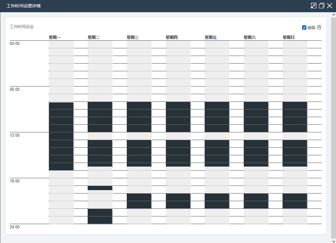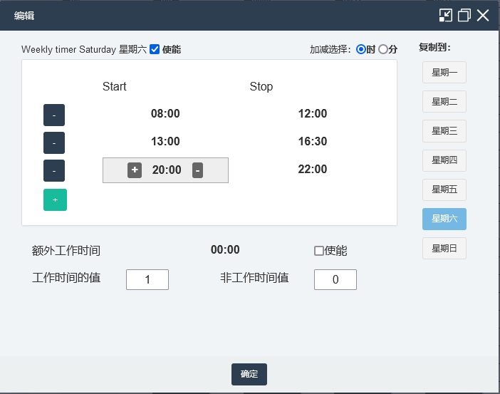 為了更好地滿足復(fù)雜工況的需求,設(shè)備的控制和管理需要更靈活的配置,除了定時(shí)啟停,還需要更全面的時(shí)段工作控制設(shè)置。此系統(tǒng)恰好能滿足這種靈活的設(shè)備,它可以自定義一周七天中,每天工作時(shí)間從幾點(diǎn)到幾點(diǎn),非工作時(shí)間是幾點(diǎn)到幾點(diǎn),工作時(shí)間的狀態(tài)是關(guān)閉還是開啟,非工作時(shí)間的狀態(tài)又是什么,可自由設(shè)置,適用于工廠車間的風(fēng)機(jī)、空壓機(jī)、環(huán)保設(shè)備的控制。