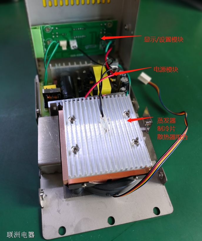 由風(fēng)扇將含濕量較大的空氣吸入除濕裝置內(nèi),在流經(jīng)低溫的蒸發(fā)器時(shí),空氣中的一部分水蒸氣在蒸發(fā)器表面凝結(jié)成水珠析出。在蒸發(fā)器下部設(shè)有集水盤,將冷凝水收集起來流入排水管并向室外排出。蒸發(fā)器一般是像散熱器一樣的鋁板,下部緊貼半導(dǎo)體制冷片,制冷片工作時(shí)會(huì)將蒸發(fā)器的熱量吸走,從而使其溫度降低。與制冷片連接的是散熱專用的散熱器和風(fēng)扇。