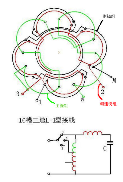 圖中1,2,3分別表示高中低三個(gè)速度,a是公共端,M是電容端,電容接到a和M之間。 此繞組結(jié)構(gòu)相對(duì)簡單,線圈數(shù)量較其他形式的繞組要少,且調(diào)速性能較好。是三速電機(jī)應(yīng)用Z多的一種繞組形式。