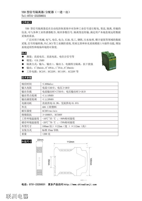 YBD 型信號(hào)隔離器系列信號(hào)隔離器,電壓、電流隔離器將直流電壓或電流信號(hào)經(jīng)過隔離傳送,轉(zhuǎn)換成所需的信號(hào)給其他儀表?梢耘c單元組合儀表及DCS、PLC等系統(tǒng)配套使用,給予現(xiàn)場儀表信號(hào)隔離、信號(hào)轉(zhuǎn)換、信號(hào)分配、信號(hào)處理等,從而提高工業(yè)生產(chǎn)過程自動(dòng)控制系統(tǒng)的抗干擾性能力,保證系統(tǒng)的穩(wěn)定性與可靠性。本產(chǎn)品品種分為一進(jìn)一出、一進(jìn)二出、二進(jìn)二出,且輸入、輸出磁隔離。并且大量運(yùn)用于配電柜和隔離箱等各種工業(yè)場合。