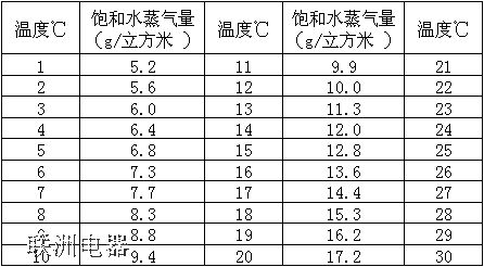 F:在同樣溫度下空氣的飽和水蒸氣量(相對(duì)濕度),g/立方米,如下圖表。