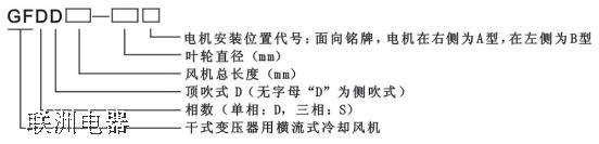 例:風機型號為GFDD470-120A,表示工作電壓單相220V、風機總長為470mm,葉輪直徑為120mm,電機安裝在右側的頂吹式干式變壓器用橫流式冷卻風機。